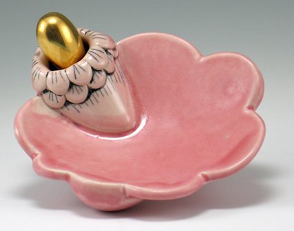 Lisa Johnson’s work involves metalsmithing and jewelry. Her undergraduate work at Ohio’s Miami University was followed by a Masters of Fine Art from Indiana University. Of her current work, she states, “The work I create exhibits vast methods of construction from both metalsmithing and ceramic disciplines.” Her works convey her further interest in, “the juxtaposition of puns, translations, irony, and duality. Through identifiable objects my obsession with redefining the recognizable is a direct expression of observations or experiences that communicates as appealing, stimulating, and sometimes humorous.”