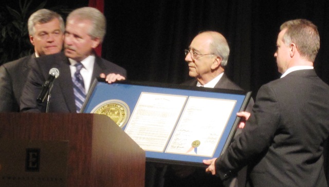 (below L-R) Senator Jim Tracy, Senator Bill Ketron, Jim Demos and Representative Mike Sparks present the Business Legend with a joint Senate-House resolution that thanks him for his service to the community. .