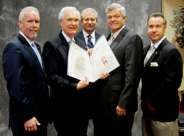Leadership Rutherford 2012 President Kevin Arnold asked WGNS' Bart Walker to step forward as this year's recipient of this honor. Leadership Rutherford (LR) is an educational program sponsored by the Chamber, that trains local residents who wish to better serve their community. Ironically, Bart, his wife Lee Ann and son Scott are all graduates of the program. His daughter Kristin is a graduate of the local LR program in high school. The Rutherford County delegation to the General Assembly presented him with a joint Senate-House resolution relating to the Pinnacle Award. (L-R below) Representative Joe Carr, Bart Walker, Senators Bill Ketron and Jim Tracy, and State Representative Mike Sparks.