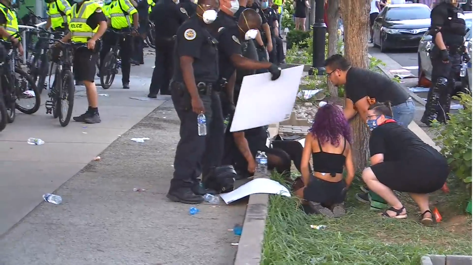 6PM Incident: In the midst of yelling, chanting and more, Metro Officers came to the aid of a woman who appeared to have over-heated and lost her strength. The incident occurred earlier in the evening around 6PM. One officer used a sign from a protester to wave as a fan for the female to cool off (as seen below).