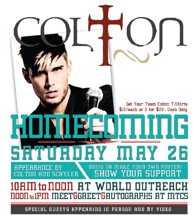 After the concert at World Outreach, fans will follow Colton to his alma matter--Middle Tennessee Christian School at 100 East MTCS Drive at Memorial. He will be available for photos and autographs at MTCS.
